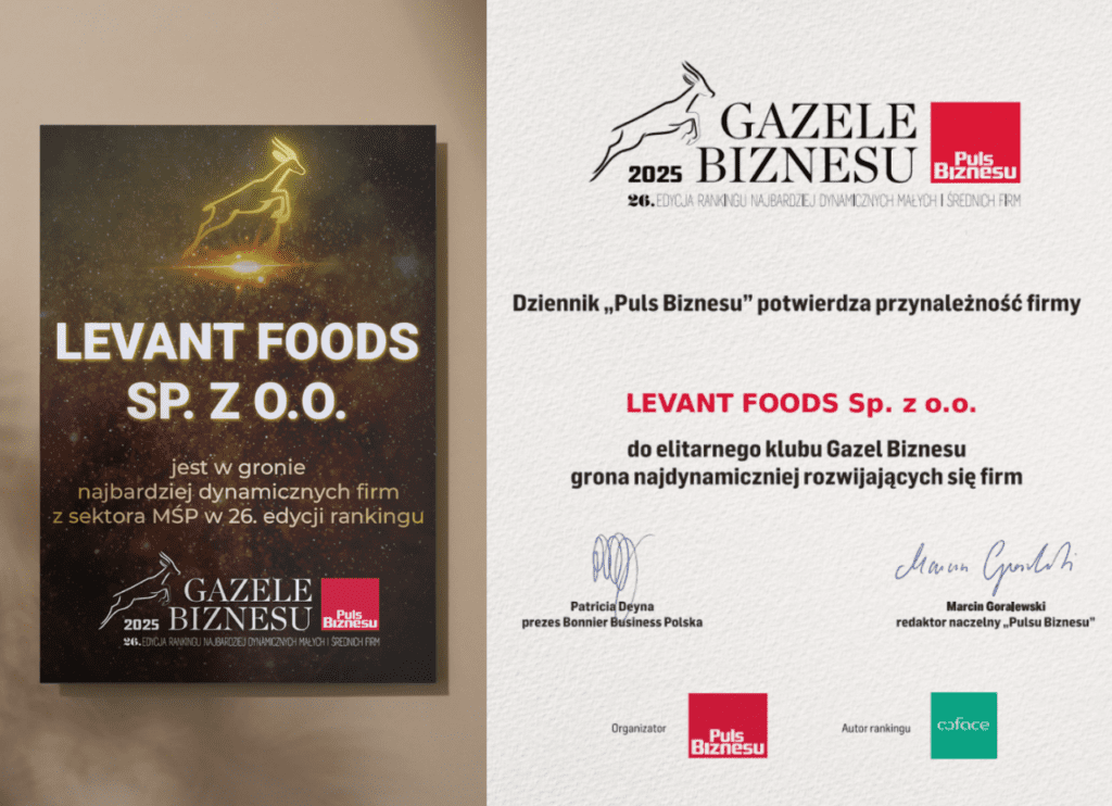 LEVANT FOODS Sp. z o.o. znalazł się w prestiżowym gronie laureatów Gazele Biznesu 2025 – rankingu najbardziej dynamicznie rozwijających się polskich przedsiębiorstw z sektora MŚP, realizowanego w ramach 26. edycji zestawienia.