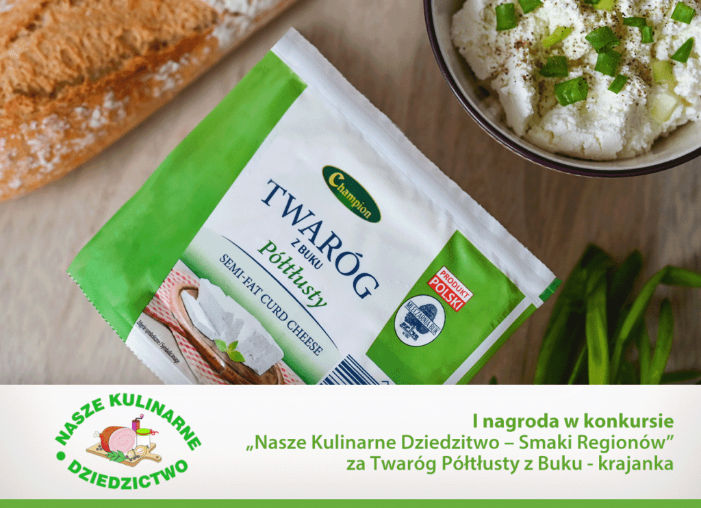 Otrzymaliśmy I nagrodę w konkursie „Nasze Kulinarne Dziedzictwo – Smaki Regionów” za Twaróg Półtłusty z Buku – Krajanka Champion. Najlepsze smaki prosto z Mleczarni Buk. To już kolejna nagroda za nasze wyroby nabiałowe! Twaróg półtłusty – krajanka to prawdziwy champion!