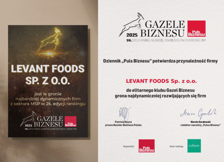 Z dumą informujemy, że LEVANT FOODS Sp. z o.o. znalazł się w prestiżowym gronie laureatów Gazele Biznesu 2025 – rankingu najbardziej dynamicznie rozwijających się polskich przedsiębiorstw z sektora MŚP.