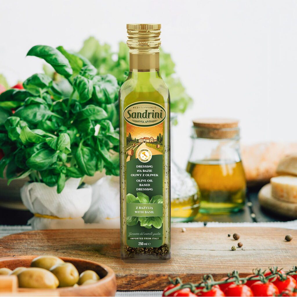 Oliwa z oliwek Extra Virgin z dressingiem z bazylii to połączenie doskonałej jakości oliwy z oliwek z naturalnym ekstraktem z bazylii, co nadaje temu produktowi wyjątkowy, świeży smak i aromat.